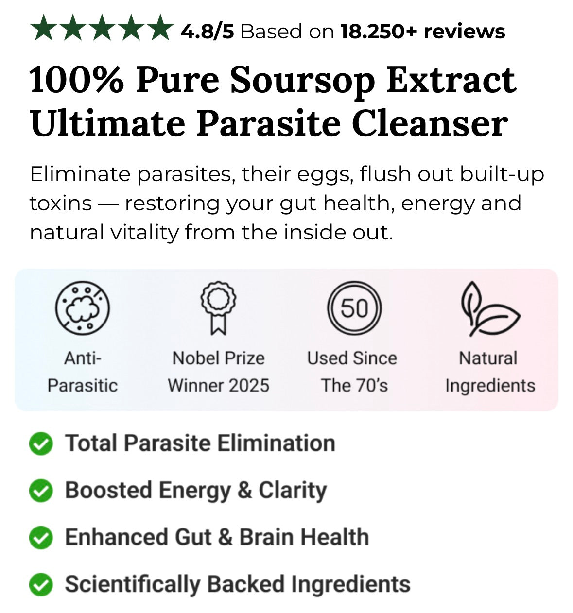 Soursop Extract effectively eliminates parasites, their eggs, and toxic debris from your body in 25 days.